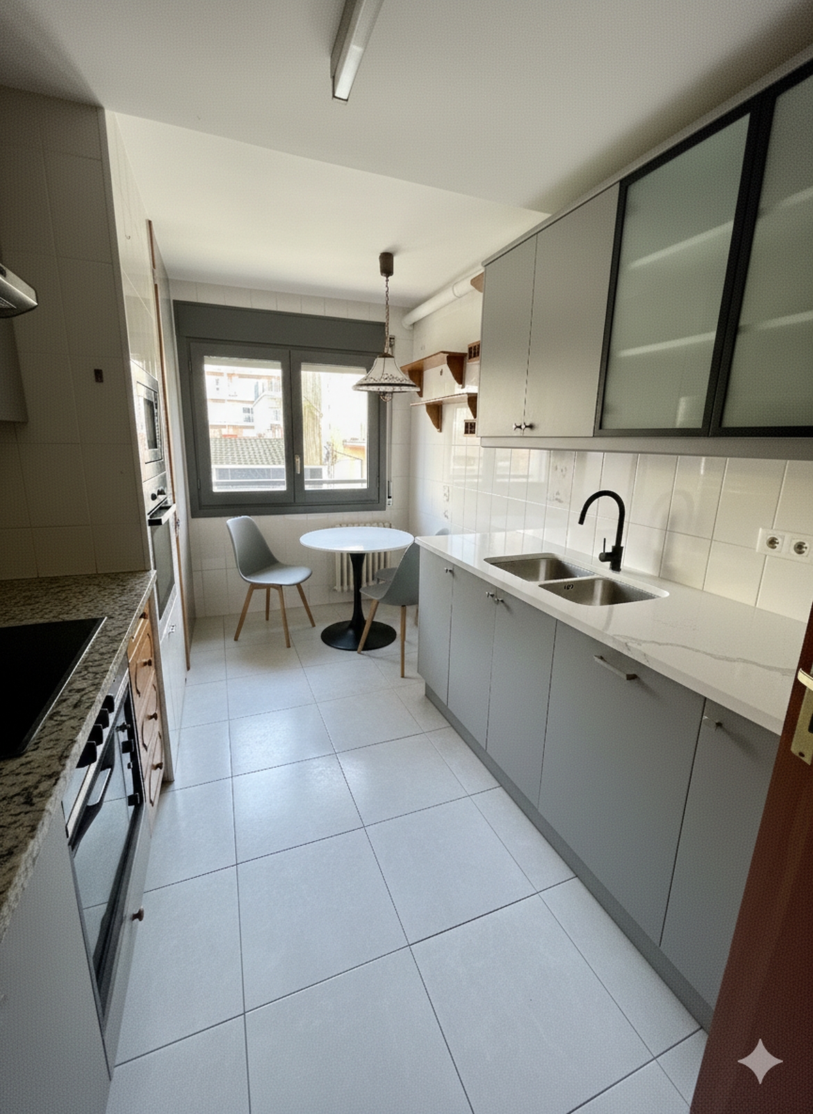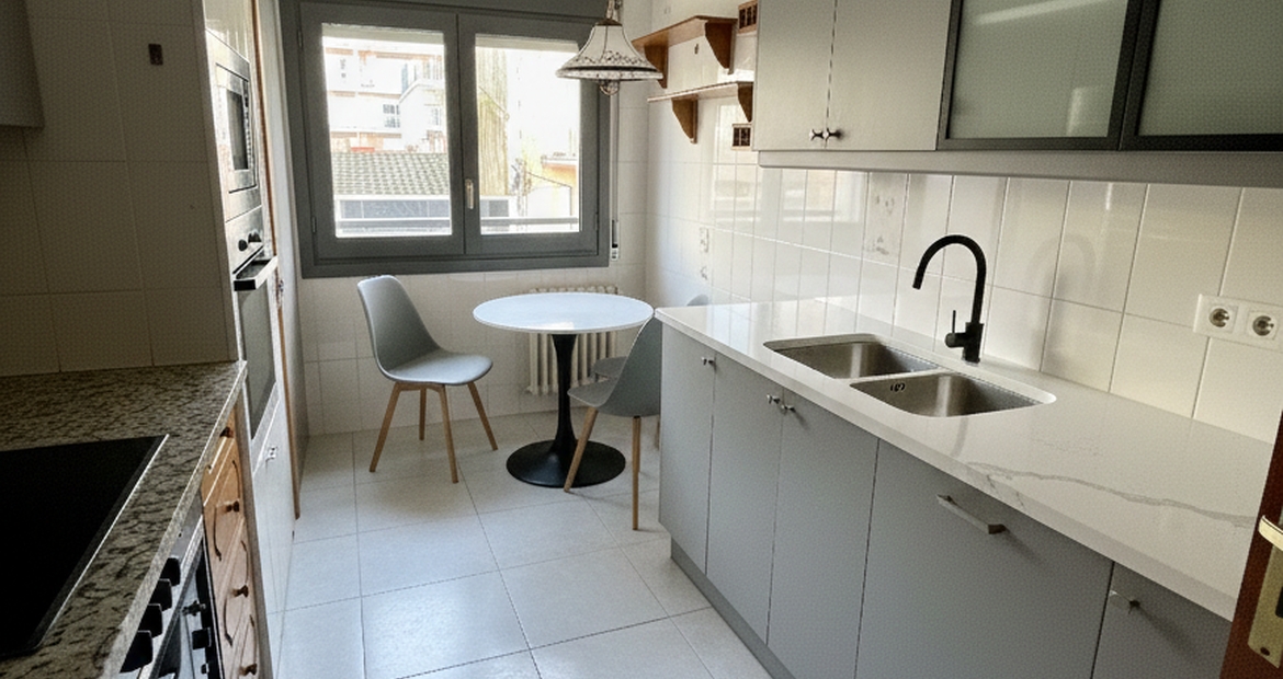 Cocina Independiente: Es una pieza muy funcional y práctica que destaca por su luminosidad. Cuenta con una ventana que inunda el espacio de luz natural y una salida directa al balcón exterior. Aunque admite una actualización estética, es totalmente operativa y está lista para usarse desde el primer día.